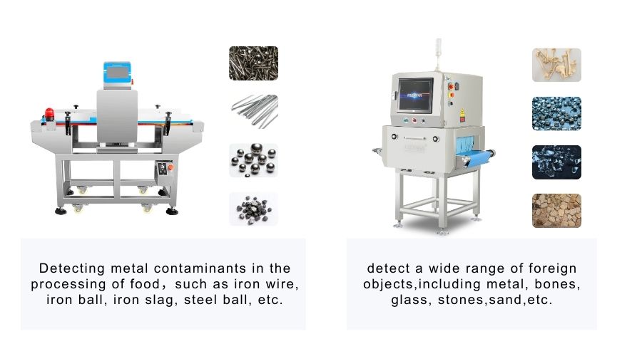 This depends on your needs. If your product only needs to be checked for metal foreign objects, you can choose a metal detector. If you need to detect other abnormalities besides metal foreign objects, such as glass fragments, stones, or packaging defects, you can choose an X-ray foreign object detection machine, which provides a more comprehensive detection range.